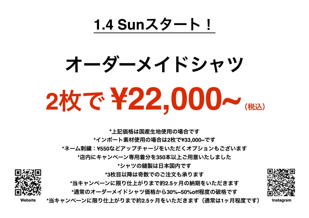 Information 1.4 Sunスタート <“Made-to-measure shirt 2pcs = from 22,000yen” sale> 2025.12.31 会期は2.2 Monまでです