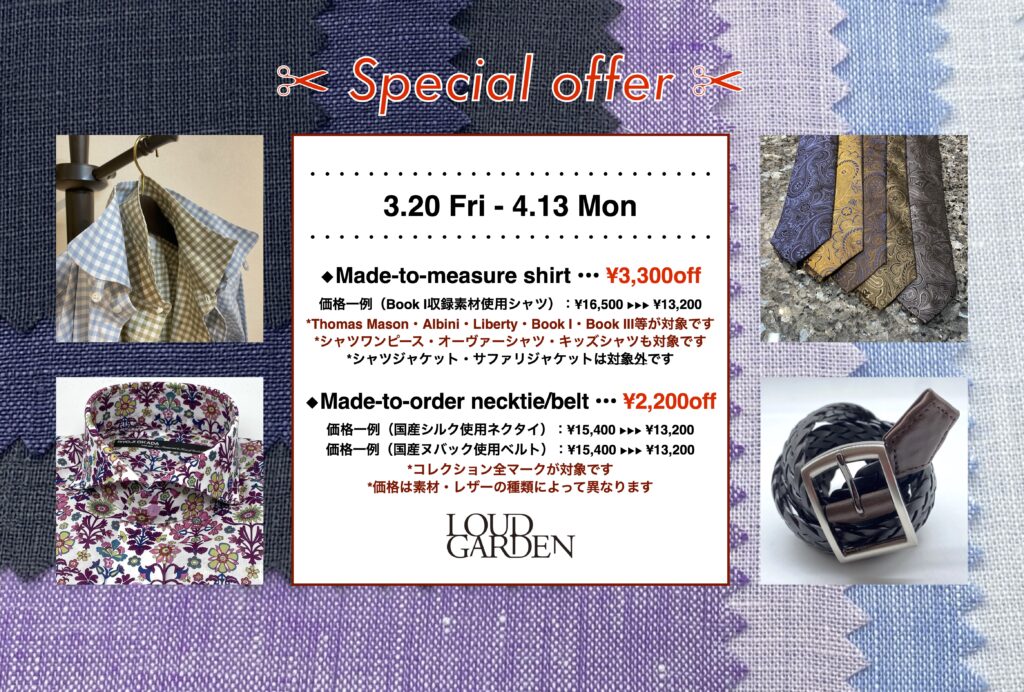 3.20 Fri – 4.13 Mon <オーダーメイドシャツ ¥3,300 off キャンペーン>・<オーダーメイドネクタイ/ベルト ¥2,200 off キャンペーン>